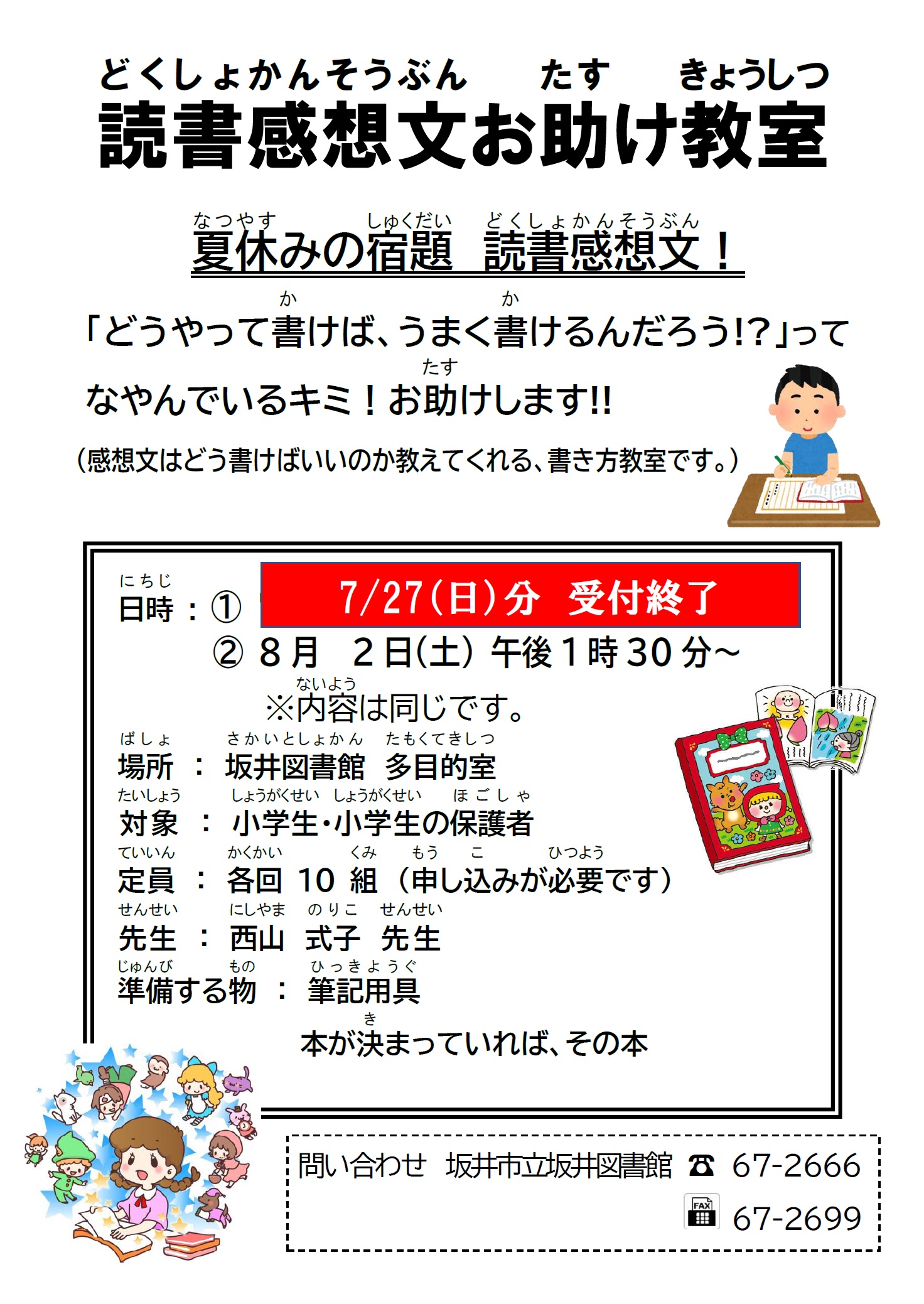 感想文をどう書けばいいのか教えてくれる、書き方教室です。 講師:西山 式子 先生 日時:7/27(日)13:30~ 8/2(土)13:30~ 場所:坂井図書館 多目的室 定員は各回10組となっていますので、申し込みが必要です。